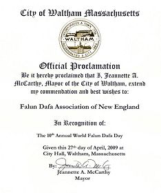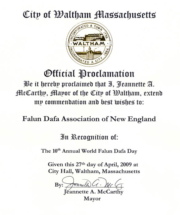 现在我,渥森市市长,珍妮特•麦卡锡,特此向新英格兰法轮大法学会表示赞扬和衷心的祝愿,嘉奖第十届世界法轮大法日