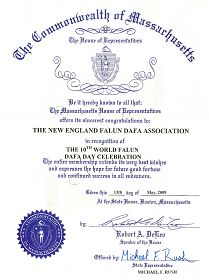 麻萨诸塞州众议院向新英格兰法轮大法协会致以最衷心的祝贺!庆贺二零零九年世界法轮大法日全体众议院议员献上最美好的祝愿,祝你们事事顺利,不断取得成功。