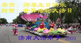 ![]() 学员们举起“普天同庆法轮大法日”的花环,走在游行的路上 |
