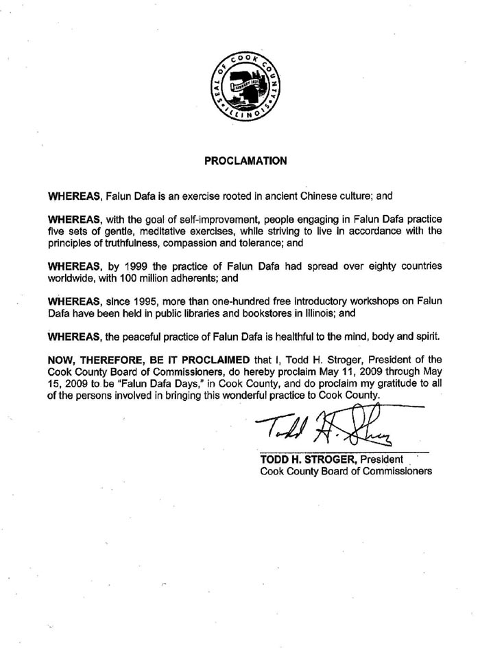 因此,我,托德•斯托葛尔,库克郡郡政厅主席,宣布二零零九年五月十一日至五月十九日为库克郡的法轮大法日,并向所有参与将这个美好的功法传到库克县的人们表示感谢。