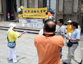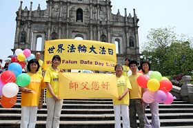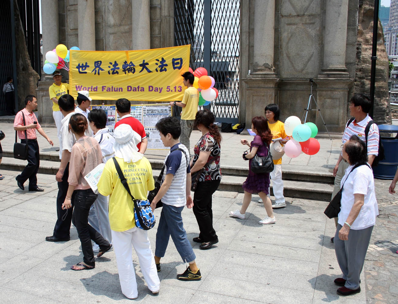二零零九年五月十三日,澳门法轮功(法轮大法)学员穿上写着“法轮大法好”的黄色上衣,手持印有“世界需要真、善、忍”的色彩缤纷的气球在大三巴真相点前,向游人介绍大法的美好,揭露中共对法轮大法的残酷迫害,希望中外游客都在明白真相后,有一个美好的未来。