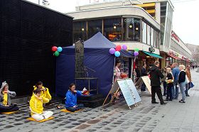 以前曾经在电视上看到过诬蔑法轮功的不实报道的一个芬兰人,接下真相资料后,又观看了学员的功法演示,还问了许多问题。他原来并不了解什么是法轮功,今天看到了学员们在这里活动,引起了他的思考,他想听听更多有关法轮功的信息,更进一步地了解到底什么是法轮功。