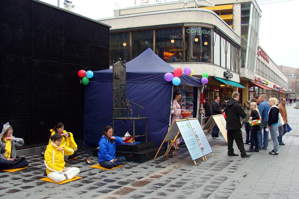 天空中飘着小雨,赫尔辛基颇有一番寒意,学员们挂起了五彩的气球,准备了漂亮的莲花,摆开了真相展板,同时用大屏幕向人们展示大法在全世界洪传的盛况。祥和的音乐声中,学员们进行功法演示,成了广场上一道亮丽的风景线。