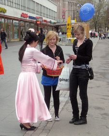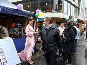 有些学员穿着漂亮的汉服派发资料,赠送学员们亲手制作的手工莲花。她们的笑容和祥和使很多路过的人停下匆匆的脚步。得到莲花的人们都非常高兴。一位上了年纪的女士说,她将要把这朵莲花献给她的母亲,因为第二天是母亲节。另一位女士赞叹说:“哇,这么漂亮的花,这真的是免费的吗?”她又问:“你们是为什么事情在这里呢?”听说是法轮功学员的活动,她说道:“哦,我听说过法轮功和(发生在中国的)这场迫害。我也是听到一位法轮功学员告诉我的在中国发生的事情。你们做得非常的好。”