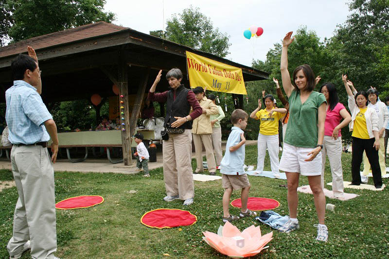 ![]() 法轮功学员在北卡罗莱纳州首府洛丽市的普能公园庆祝世界法轮大法日。游人当场学炼法轮功。 |