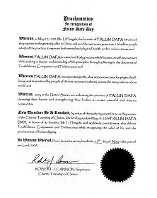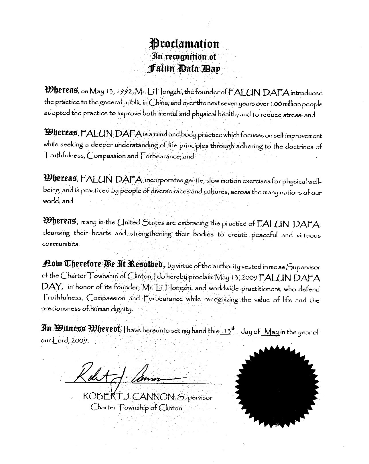 鉴于此,我,克林顿宪章镇(Charter Township of Clinton)镇长,在此宣告二零零九年五月十三日为克林顿宪章镇“法轮大法日”,以向法轮功创始人李洪志先生和全世界的法轮大法学员表示崇高敬意,他们在遵循和维护真、善、忍法理,珍惜生命价值和人类尊严的宝贵。