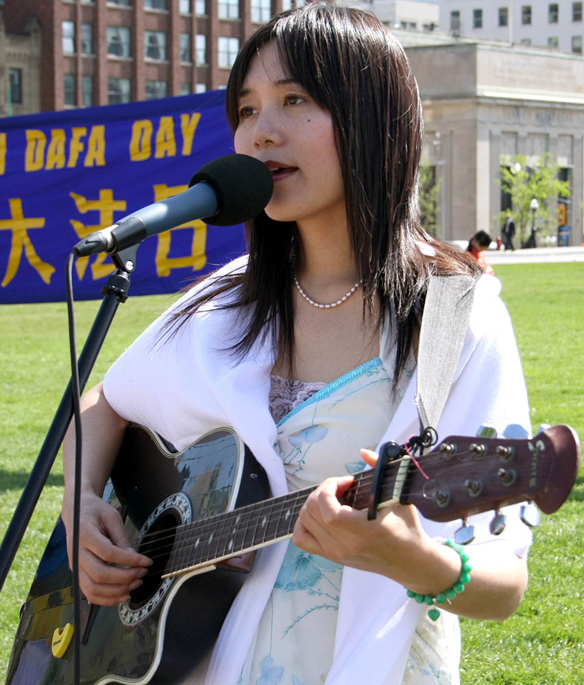 法轮功学员王汉娜女士在今天的庆典中用优美的歌声向人们传递着大法的美好。她来自于中国沈阳。因为上访请愿和不放弃信仰,她先后两次被中共非法关押。在以残忍迫害法轮功学员而臭名昭著的马三家劳教所,汉娜被非法关押一年,后又被非法关押在北京大兴女子劳教所,并被强迫服用摧残神经的药物。在劳教所中,汉娜遭到了肉体和精神的摧残。后来,她拒绝参加强制劳动,以抵制迫害。