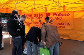 匆匆行进的脚步有的停下来观看展板;有的未停下来却向法轮功学员伸出大拇指表示敬意;有人已不用看展板就向同伴解释法轮功在中国遭到的残酷迫害;更有明白真相的商贩主动腾出地方给法轮功学员洪法;执勤警察也过来热情关照;很多波兰人不停地问:需要我做什么能够帮助你们?十年了,必须停止这种迫害!更多的人在问;哪里可以学到法轮功?我要学法轮功!