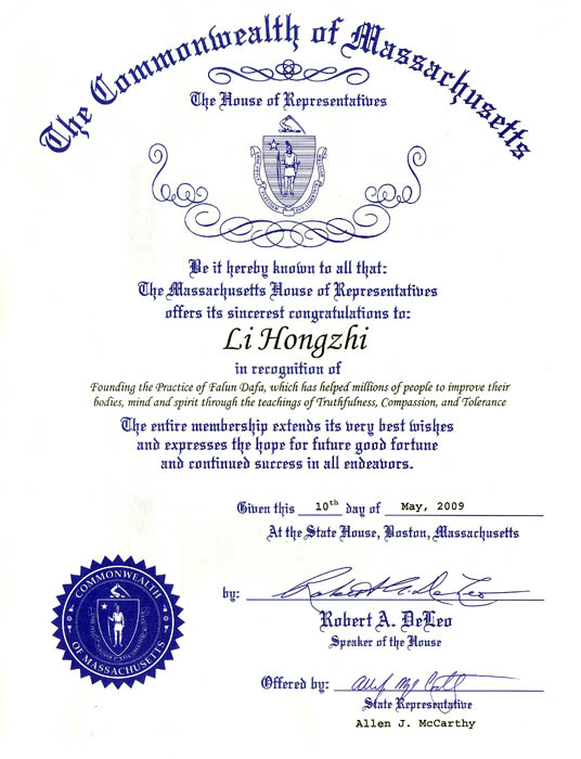 麻萨诸塞州众议院向李洪志先生致以最衷心的祝贺!祝贺您创立了法轮大法修炼,并通过教导真、善、忍,使无数人身心健康,道德回升。全体众议院议员献上最美好的祝愿,祝你们事事顺利,不断取得成功。