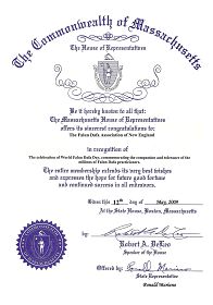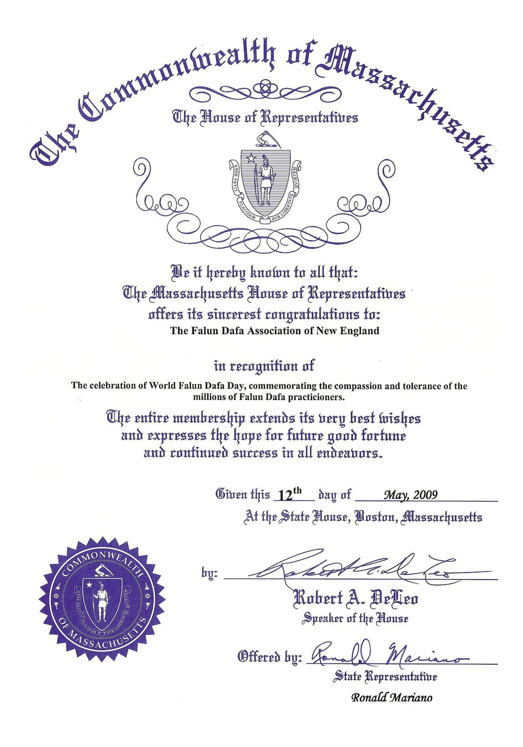 麻萨诸塞州众议院向新英格兰法轮大法协会致以最衷心的祝贺!庆贺世界法轮大法日的庆典,赞扬数以百万计的法轮功修炼者的慈悲和容忍全体众议院议员献上最美好的祝愿,祝你们事事顺利,不断取得成功。
