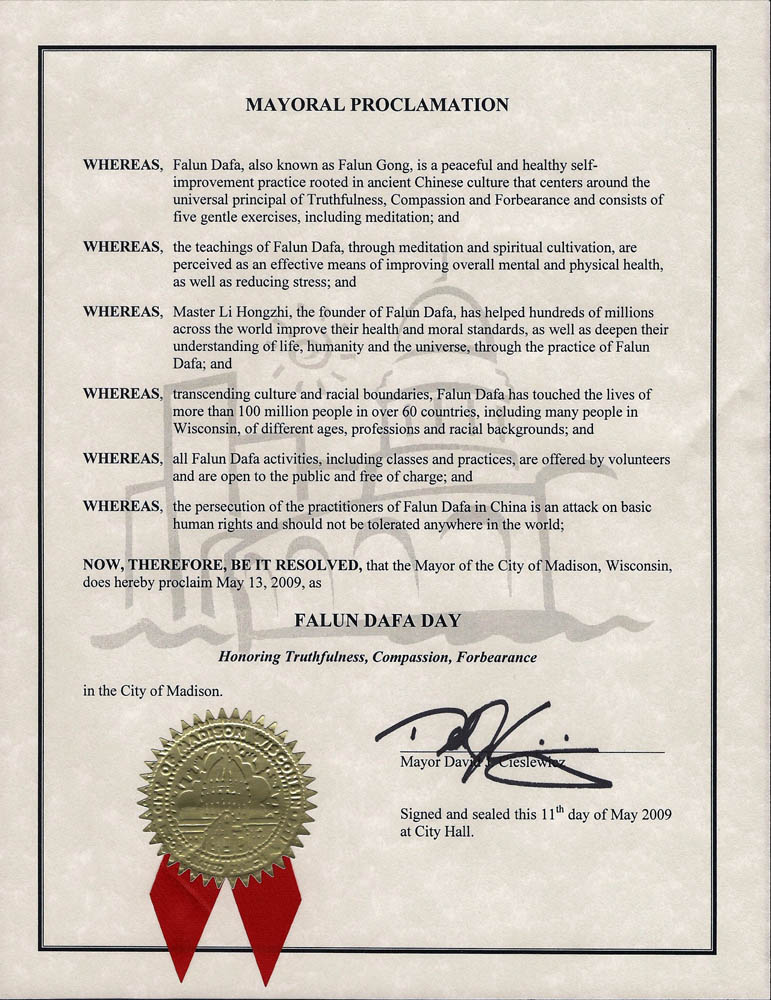 因此,我,威斯康星州麦迪逊市市长宣布二零零九年五月十三日为麦迪逊市“法轮大法日”,以表彰“真、善、忍”。