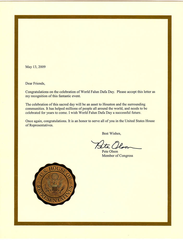 【明慧网二零零九年五月十五日】二零零九年五月十三日暨世界法轮大法日之际,美国德州国会议员皮特•欧森贺“世界法轮大法日”,庆贺奖状译文如下: