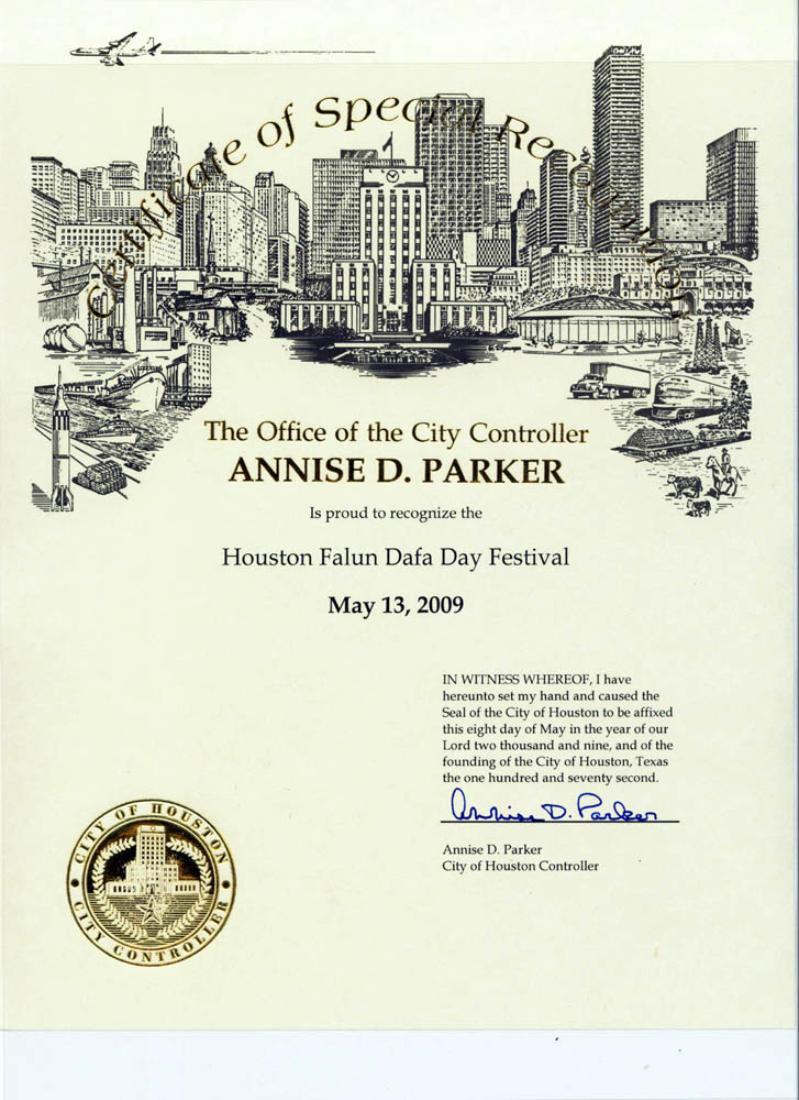 我于2009年5月13日,得克萨斯州休斯敦市建立172周年之际,亲手封印
