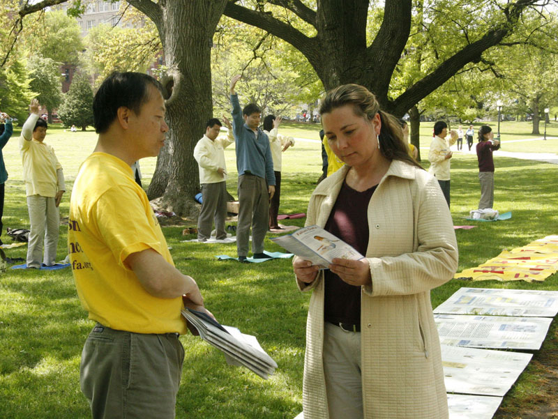 今天来这里庆祝“世界法轮大法日”的法轮功学员,大多是在美国取得了博士学位的化学家、工程师和医生,他们希望公众能更加了解这一以“真、善、忍”为原则的修炼法门。