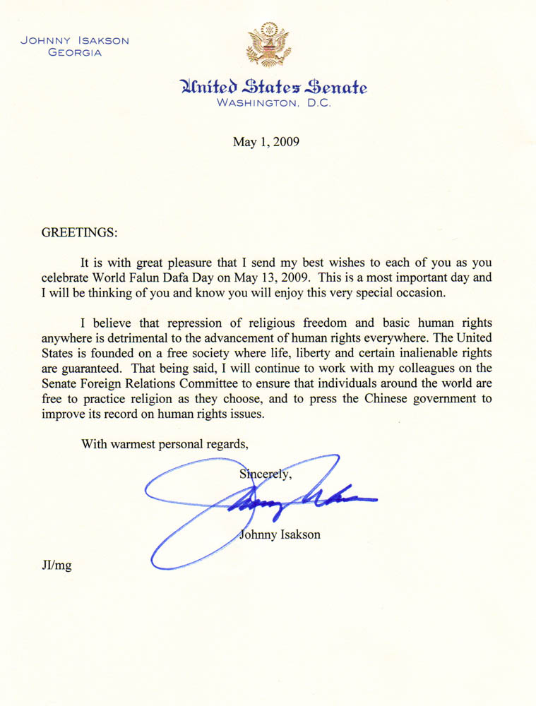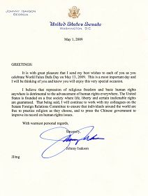 在二零零九年五月十三日庆祝世界法轮大法日之际,我非常荣幸的向你们表达最良好的祝愿。这一天是个极其重要的日子,你们在这特殊的时刻定会充满喜悦。