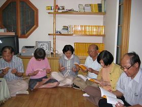 ![]() 左起彭清孟、月娥、华美、彭清一、蓓玲、彭清廉,大家一起读法轮功书籍 |