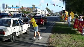 也有一些过往的车辆,里面已经挂着小莲花,司机和乘客们说他们已经知道法轮大法;当学员告诉他们今天是法轮大法日的时候,他们脸上露出了灿烂的笑容。
