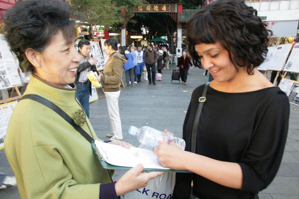 孙先生从中国来澳洲已经四年了,他说:“我每年几乎都来看你们的游行,我感到很自豪。你们声势浩大,很给我们中国人长脸,你们好象是从天上掉下来的一样,有那么多的中国人。我不喜欢共产党,所以我一听说这边有退!党!的,我就赶紧来退了。我想我算是第一批退的吧。我感觉法轮功挺好的,在澳洲难得有一个自由的环境,你们都挺祥和的,你们真的是中国的希望。”