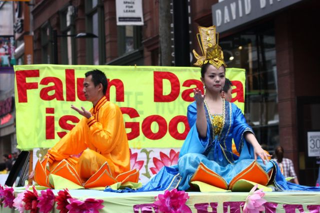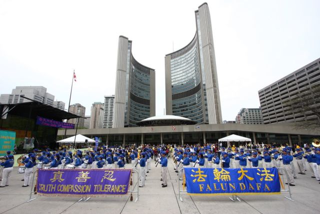 当天集会期间,下起了毛毛雨,集会一结束,就下起了大雨。百战不殆的多伦多天国乐团冒着大雨在前开路,洪亮的《法轮大法好》乐曲声震天动地,拉开了大游行的序幕。十分钟后,雨停了。游行历时两小时,吸引了路边大量的民众驻足观看,很多人还兴奋地拍照或录像。