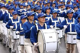 乐团吹太阳号多伦多学员Michael说:“开始时大家全身都湿了,在雨中我感觉到大家那股正的力量和齐心,所以就越吹越起劲。曲子一个接一个地演奏,没停顿地演奏着到最后。队伍中有的老人孩子也都精神饱满地坚持到最后。这是整体力量的体现。”