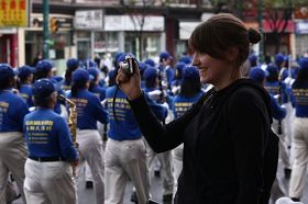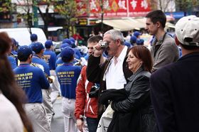 ![]() 过往的路人被法轮功学员盛大的游行所感染,纷纷驻足观看,并兴奋地拍照 |