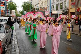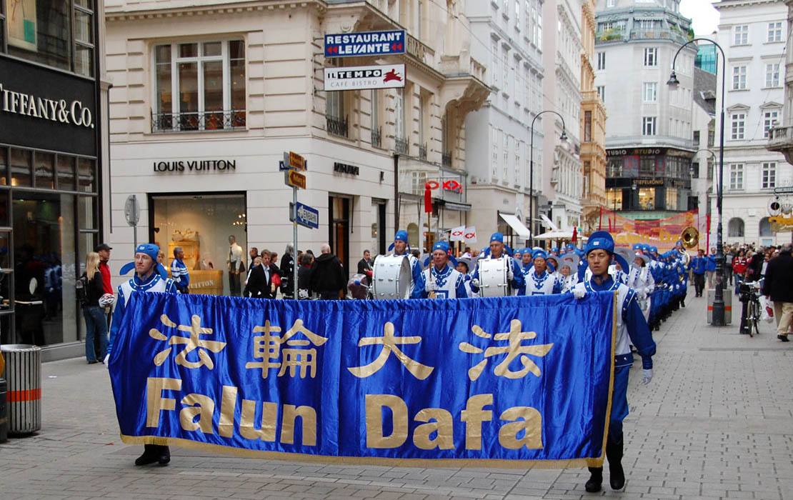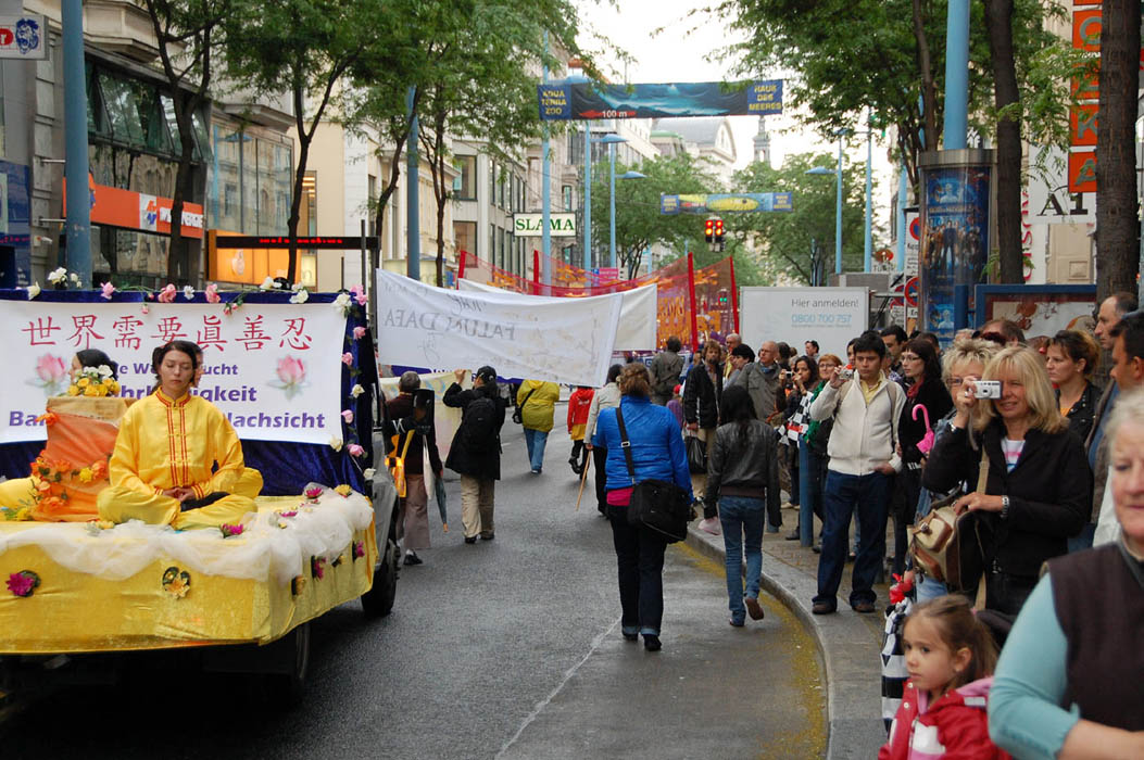 中午十二点整,游行正式开始,以欧洲天国乐团打出的“法轮大法”巨大横幅为头阵,随后是仙女队、腰鼓队、功法表演、酷刑演示等。游行队伍从维也纳一区最热闹的史坦芬广场开始途经英雄广场(Heldenplatz),然后是博物馆广场,玛利亚大街,最后是中国人聚集地中国中心(Naschmakt)。整个庆祝活动持续到晚上六点结束。