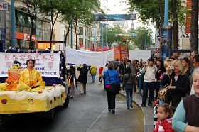 ![]() 法轮功学员在花车上展示功法 |