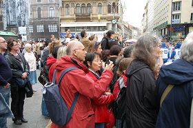 游行队伍沿途吸引了来自世界各地的观光客和当地民众。人们纷纷打听关于发生在中国的中共对法轮功残酷迫害的情况。欧洲天国乐团的闪亮登场,更是吸引了众多的围观者。人们都纷纷拿出相机拍照留念。本次活动也是“欧洲天国乐团“的第一次到访维也纳,给音乐之都增添了风采。