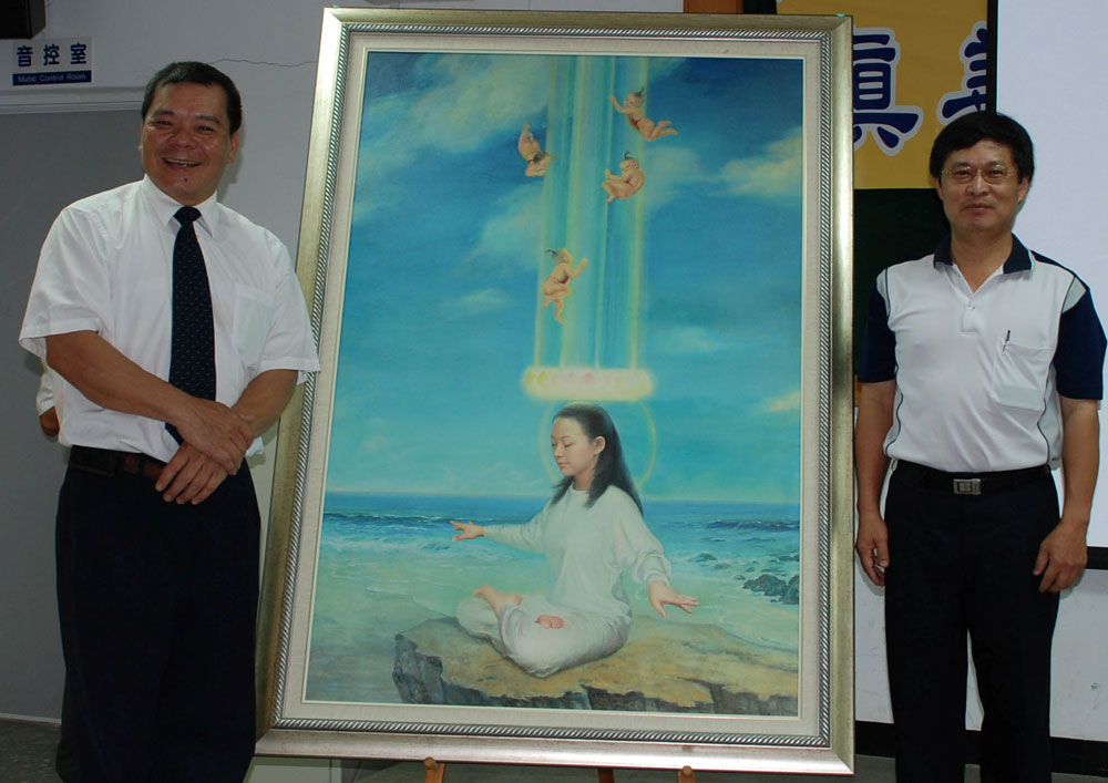 ![]() 馨愿单亲关怀协会理事长李静娟与枋寮国小校长陈文俊,共同为真善忍国际美展揭开画作“为你而来” |