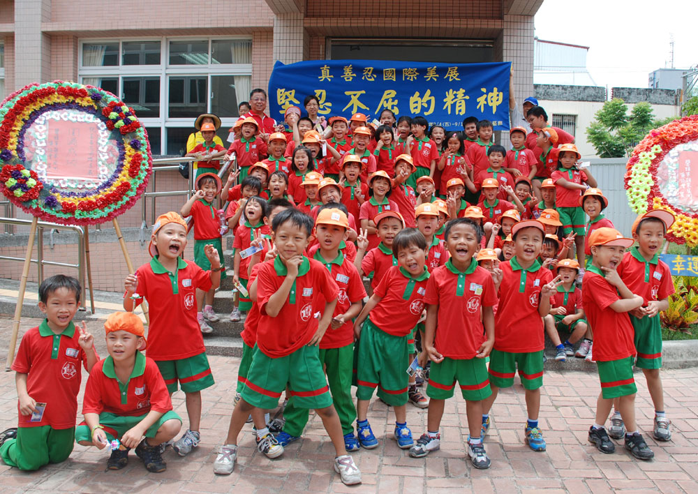 ![]() 枋寮国小师生在欣赏真善忍美展作品后,大声说出“真善忍好”并开心合影 |
