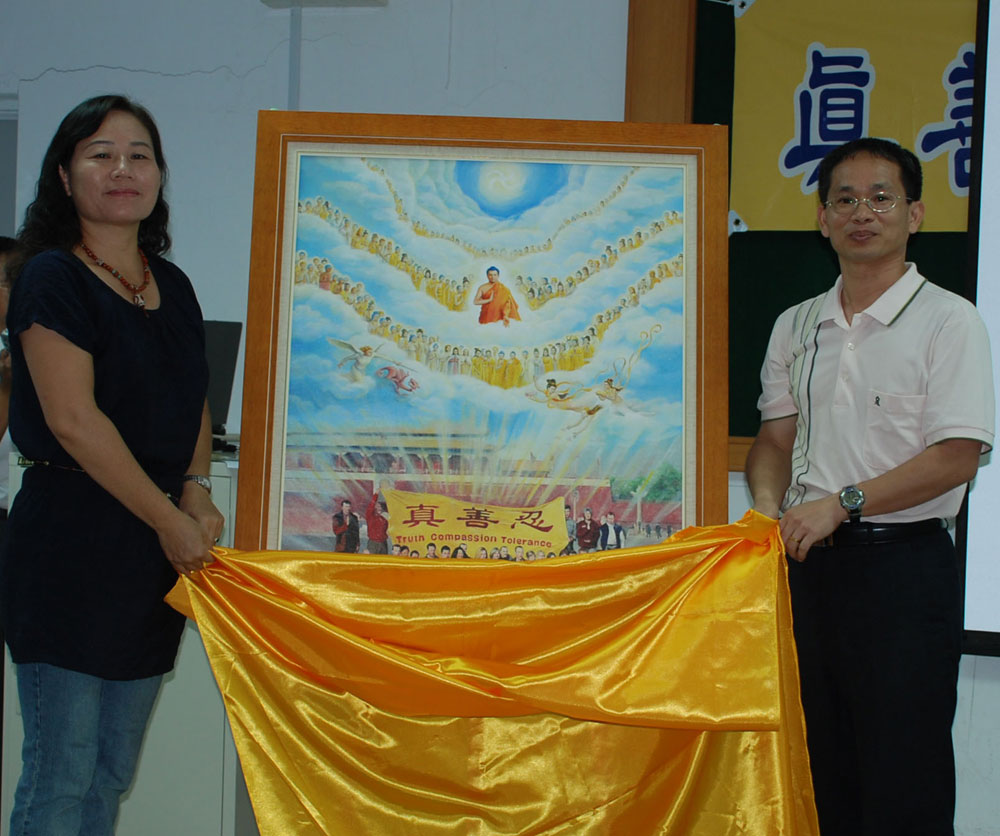 ![]() 枋寮高中校长萧耀宗与家长会长陈育民,共同为真善忍国际美展揭开画作“天人合一” |