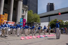 天国乐团气势磅礴的奏乐,仙女轻盈优美的舞姿,腰鼓队铿锵的鼓声,以及法轮功学员集体炼功的场面,吸引了许多路人驻足观看,纷纷摄影留念。许多人主动索取真相资料并在支持提案上签名;,多人当场要求学员教炼五套功法。