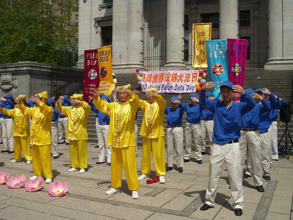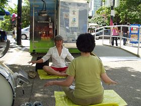 ![]() 法轮功学员演示功法时,许多路人驻足观看、摄像。 |