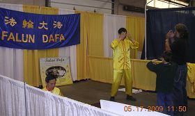 一位长者,带着家人从展台经过,学员向他介绍大法。他指着一个男孩说,他想炼功。男孩点点头,马上坐在地上摆出双盘的动作。原来这一老一少是外公和外孙。九岁的男孩子,眼睛里闪着灵气。祖孙俩来到教功的地方,一招一式的把五套功法学了一遍。