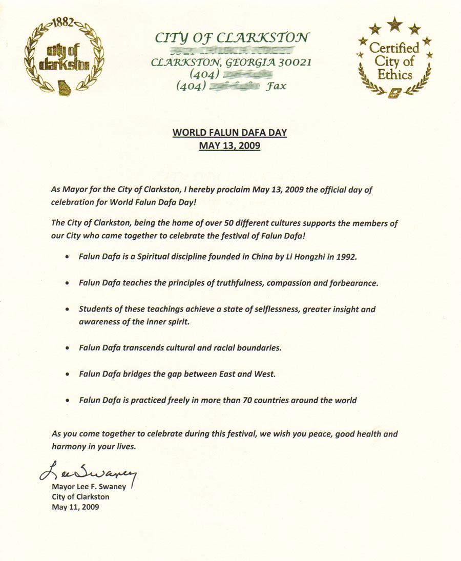身为克拉克斯顿(Clarkston)市长,我在此宣告五月十三日为“庆祝世界法轮大法日”。