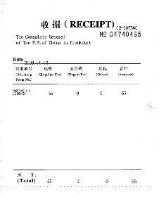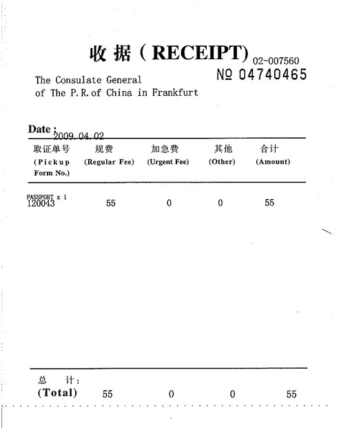 ![]() 二零零九年四月二日陈榕在德国法兰克福中领馆交了换新护照的费用五十五欧元,图为交款收据。 |