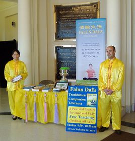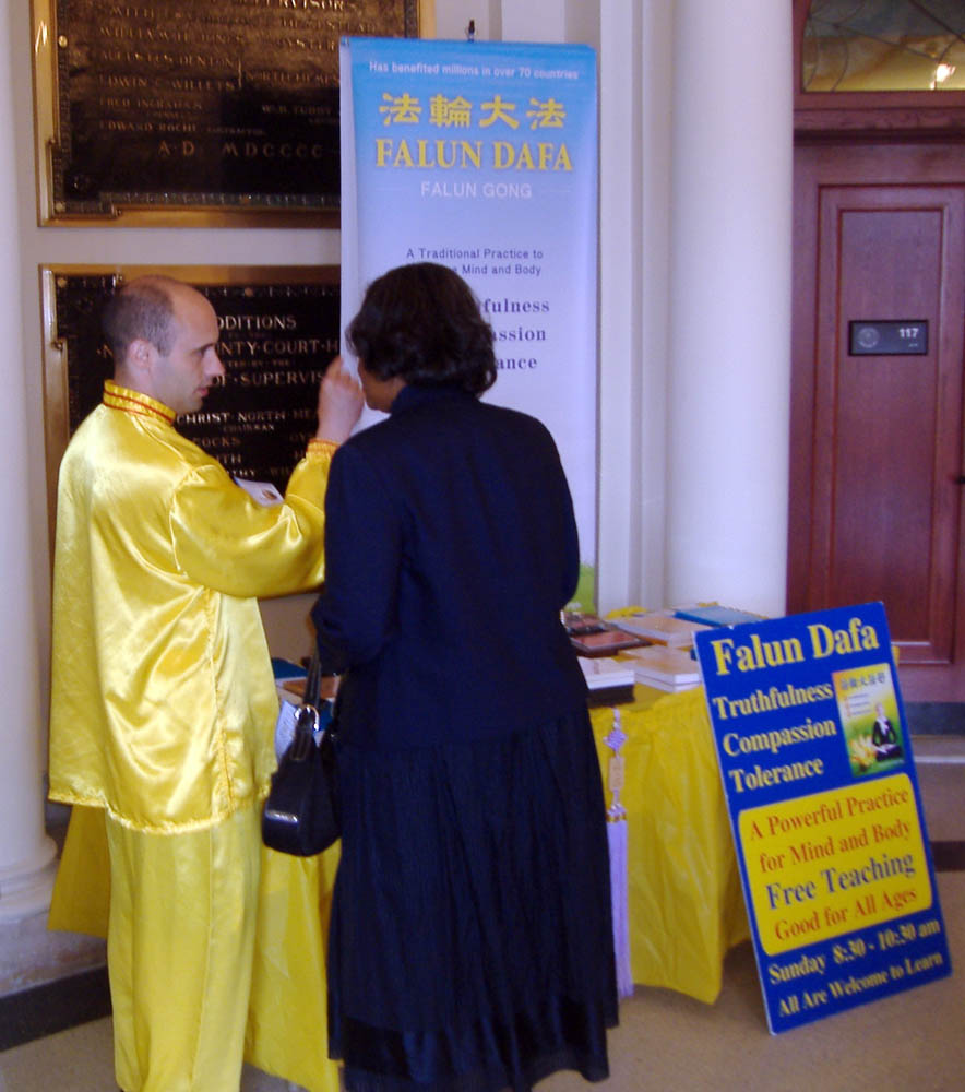 法轮功学员的展位设立在县办公大楼的中央大厅内,桌上摆放了法轮大法书籍,炼功教功带,法轮功学员参加当地活动的获奖奖杯、奖状,及各种展板等。不少县政府工作人员和当地民众拿到了传单资料,有的向学员询问如何学功,有的直接表示要来学法轮功。一位县政府官员表示要认真阅读大法书籍。