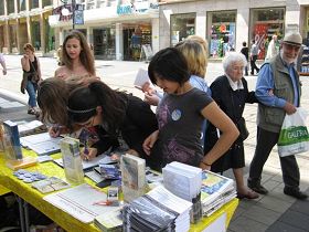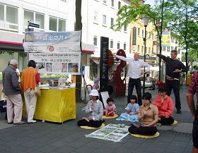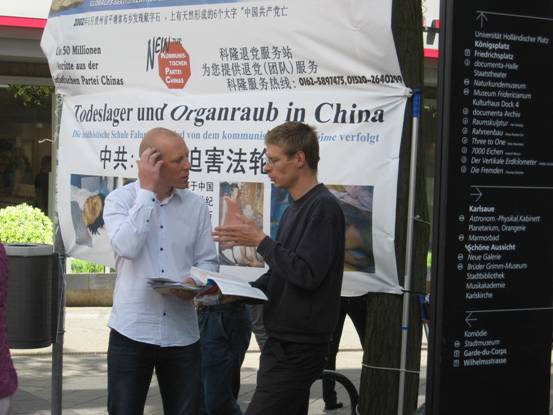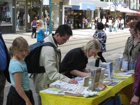 周六的卡塞尔风和日丽,国王大街人来人往。上午十一点,信息日讲真相活动刚开始,摊位前就来了众多想了解真相的人。当了解到在中国,信仰“真、善、忍”的法轮功学员无辜被残酷迫害时,很多人毫不犹豫地表示对法轮功学员反迫害活动的支持,并当场签名。有的还当场学功。