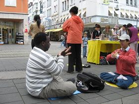 一位从美国来德国旅游的先生(Micah Saunders)在旁边观看学员炼功,久久不愿离去。他详细地询问了法轮功被中共迫害的详情和法轮功的功理功法,并当场学功。当学员告诉他,坚持炼这个功一段时间,身体就会感到能量增加,身体会得到净化,他连忙打断学员的话说:不用一段时间了,我现在就觉得身体非常舒服,我感到胳膊在我炼功时有非常奇妙的感觉,这个功太好了!