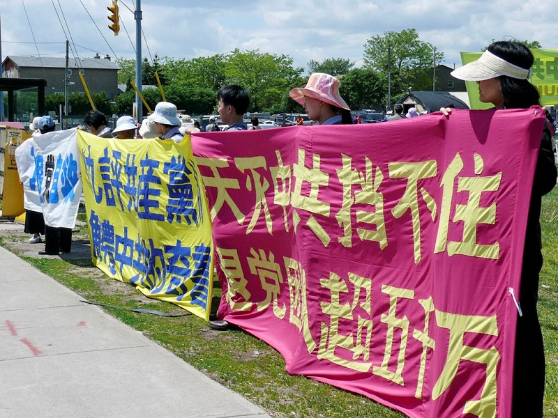 ![]() 五月三十日,加拿大多伦多退出中共服务中心在华人购物中心太古广场前声援五千五百万勇士三:退.大潮。 |