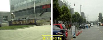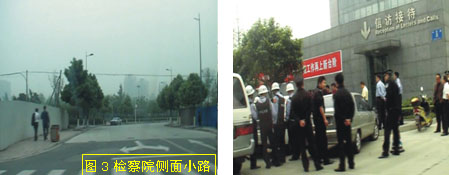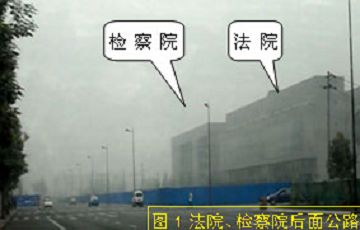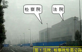 四月二十八日,早上8点过,成都的天空忽然变的非常阴暗,成都市高新区公检法系统如临大敌,高新区法院、检察院周边近两公里范围布下大量公安、便衣(便车)、警车、防暴警察及六一零、街道办等人员,意图防止大法弟子前去散发真相资料及张贴不干胶。直到二十八日深夜十一点半,在高新区法院后面围墙不足200米长的路边至少四辆便车等距离的蹲候,通向法院前门的三个交道口被闪着警灯的巡警守着。(图1法院、检察院后面公路)
