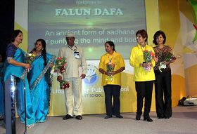 ![]() 法轮功学员的功法表演获印度全国学校协会献花 |