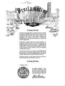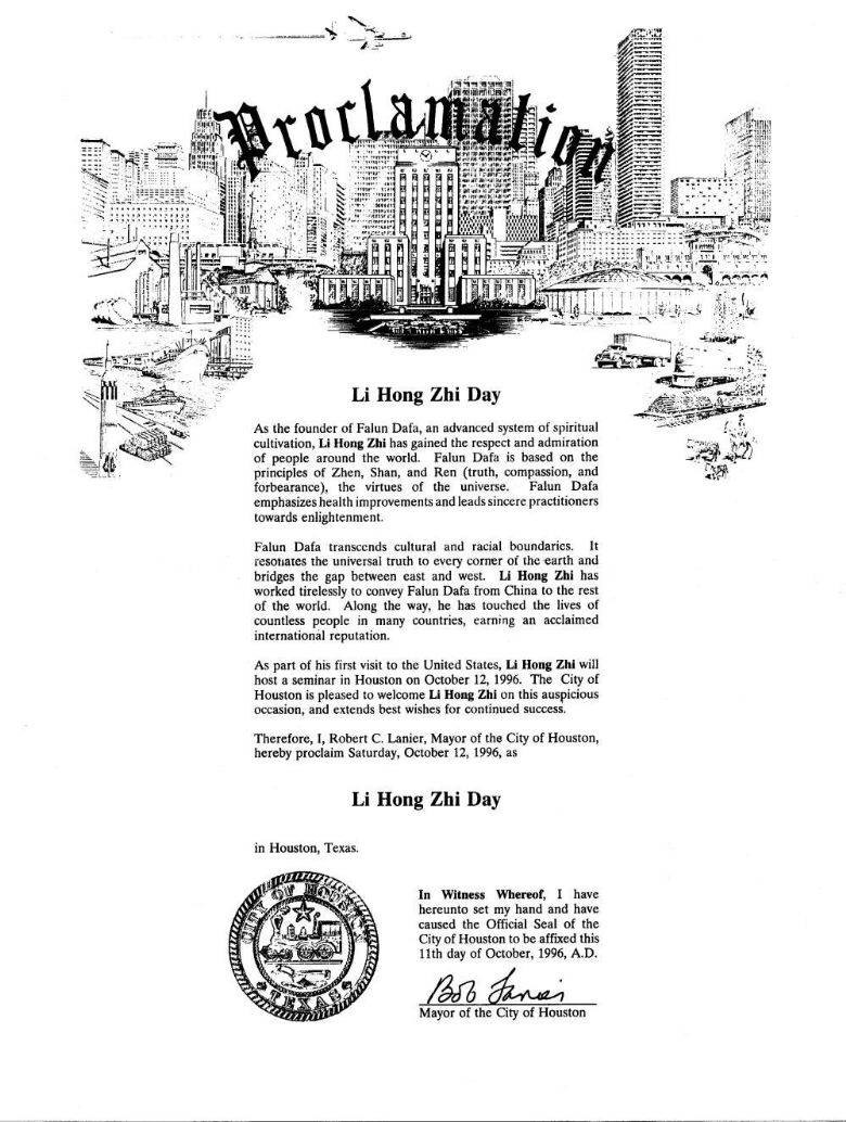 ![]() 一九九六年十月十二日美国休士顿市市长宣布当天为“休士顿李洪志大师日” |