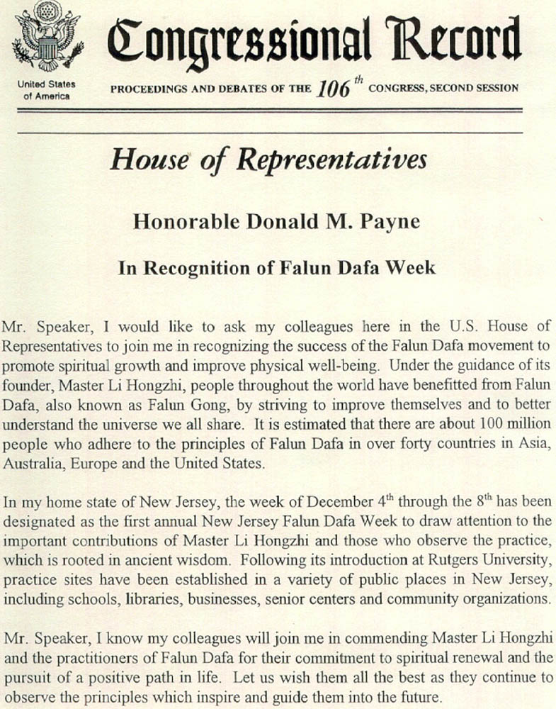 ![]() 美国国会议员颁发一零六届国会记录:表彰李洪志先生,支持法轮大法 |