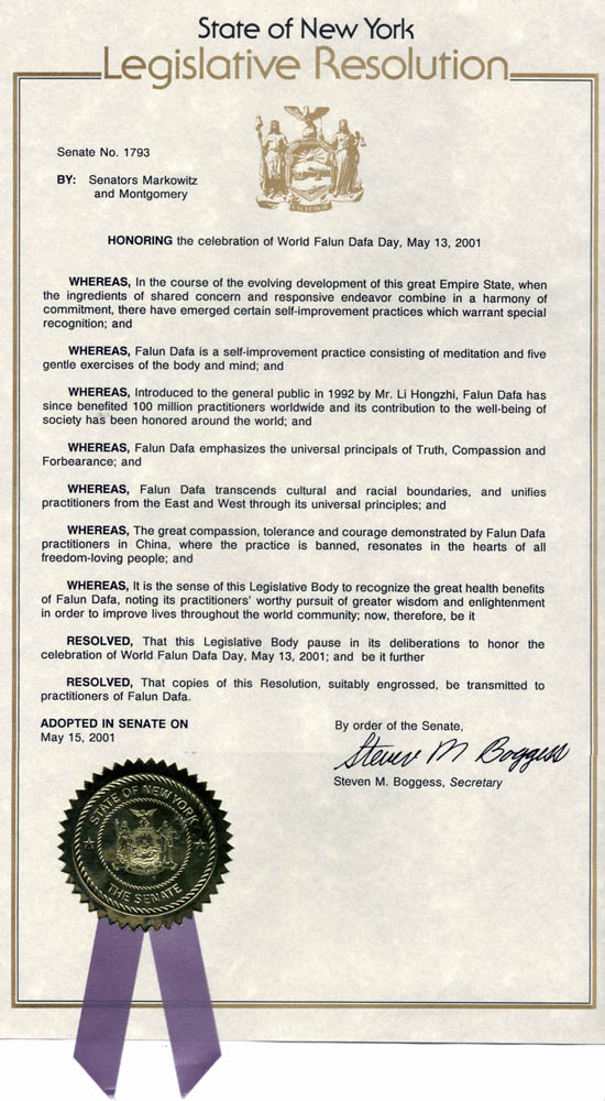 ![]() 二零零一年五月十五日,纽约州参议院发布决议赞誉“世界法轮大法日” |