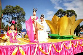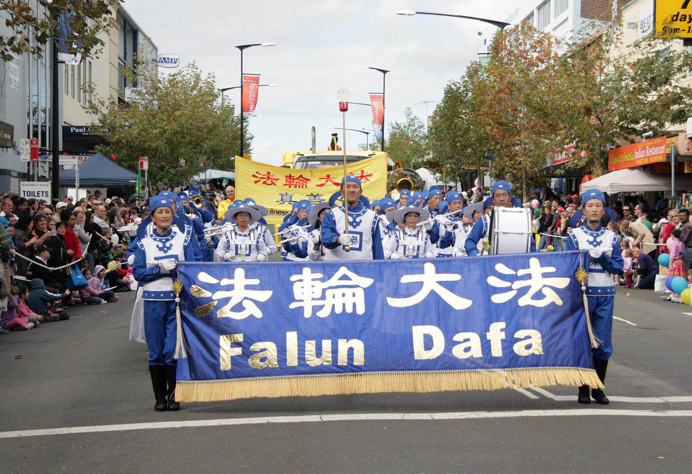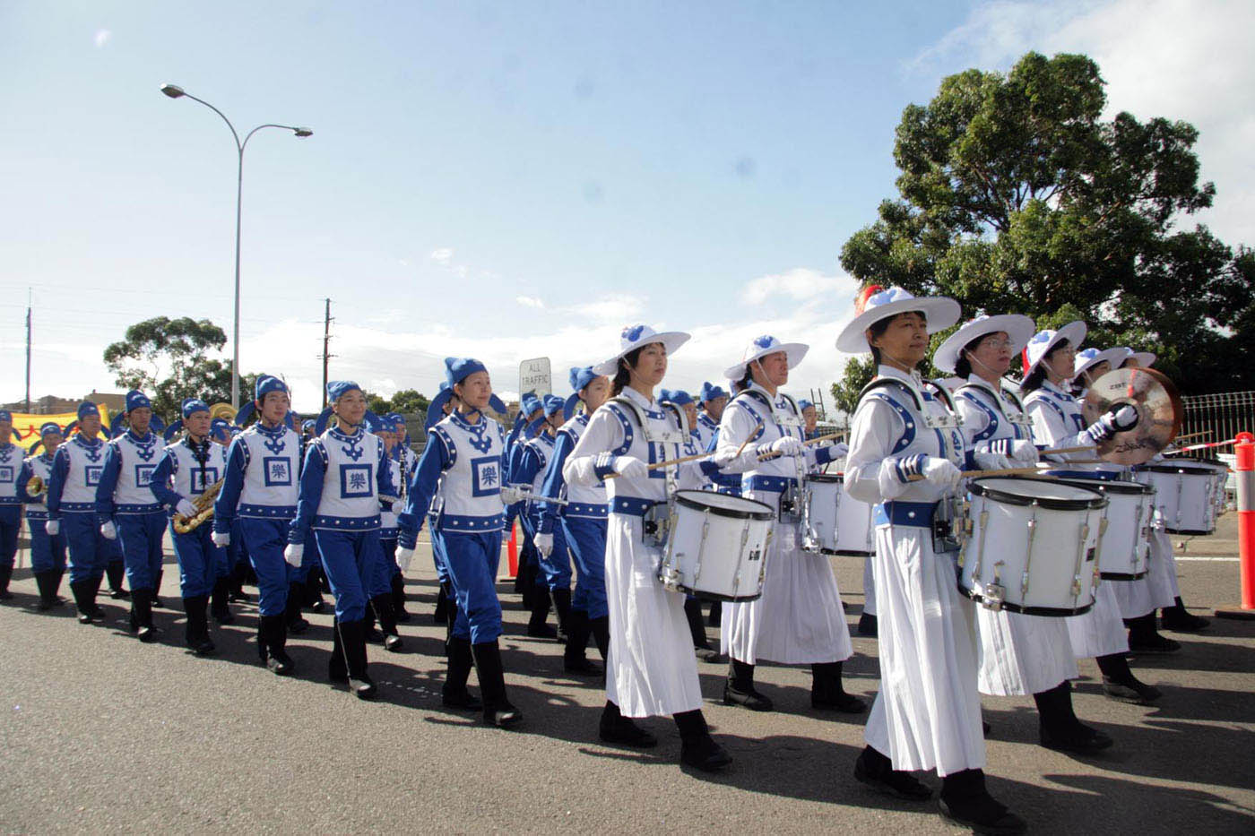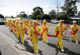 “法轮大法”横幅引领着法轮功学员游行队伍出场,天国乐团的成员身着中国传统服装,他们雄姿威武、意气风发,吹奏着“法轮大法好”、“法正乾坤”等乐曲,赢得观众的阵阵掌声。在欢声笑语、鼓号齐鸣的游行队伍中,祥和的法轮功方阵别具一格,令人瞩目。紧跟在天国乐团后面的,是精美的、装饰着盛开金莲的花车;随后是法轮功腰鼓队,腰鼓队的队员身着金黄色服装,鼓槌翻飞,喜气洋洋。看到这么壮观的队伍,他们不仅欢笑迎接,有很多观众赶紧按快门,留住这历史的镜头。他们不仅纷纷笑脸相迎,还抓住时机站在法轮功队伍旁边摄影留念。