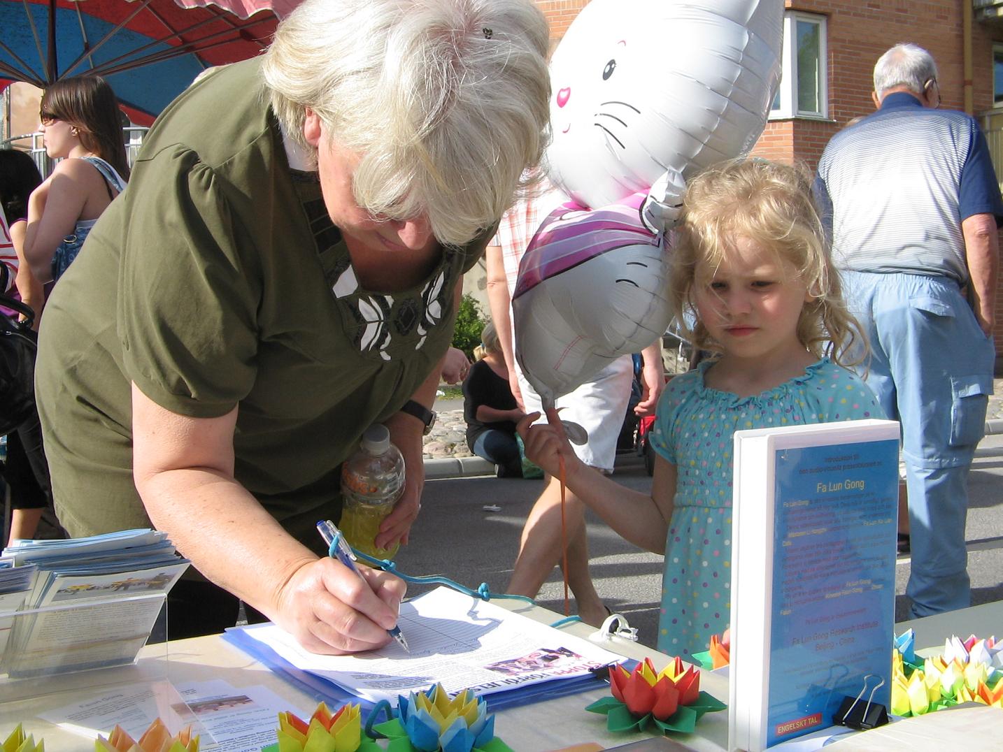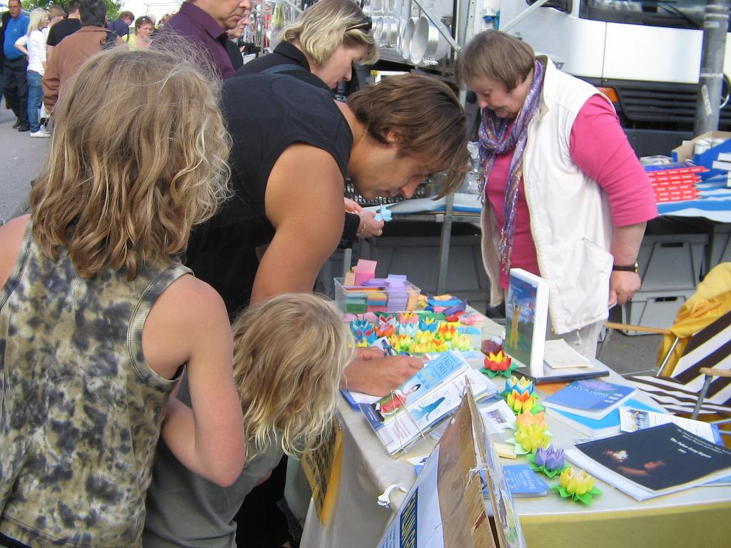 法轮功的展位设立在展销场的入口处,桌上摆放了法轮大法书籍,炼功教功带,教功录像DVD等。法轮功学员一边演示功法,一边发真相传单,并征集签名。有很多民众签名支持反迫害,制止中共活摘法轮功学员器官的暴行。有的民众拿了真相资料后,向学员询问如何学功,有的直接表示要学法轮功。