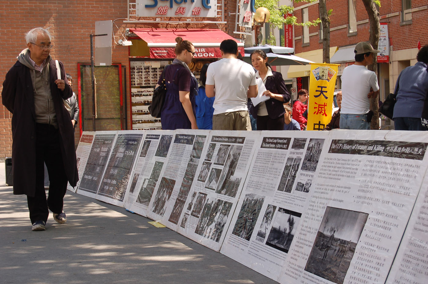 蒙特利尔唐人街的周末是华人,以及热爱中国文化、和喜爱中国食品的其他族裔人士购物及进餐的主要地方,熙熙攘攘的人群经常穿梭于公园前的道路上。这里的人们对中共迫害法轮功的暴行、及其邪恶本质早已有所了解。