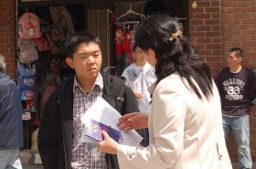 这次声援三:退.的活动形式与以往有些不同。以往退!党!服务中心的集会,主要是采取公众演讲的方式,向民众传达三:退.的信息。这次,除了现场播送大.纪.元;郑重声明和大陆退!党!声明精选外,义工们还主动与过往的人们交谈,告诉他们已经有五千五百万中国民众在中共暴政下觉醒;了解他们是否入过中共的党、团、队;同时给他们讲,为什么一定要退出中共才会平安等。有的人听讲解后,当即同意三:退.;有的人索取了《·九·评*》书回去阅读,说下周再来。