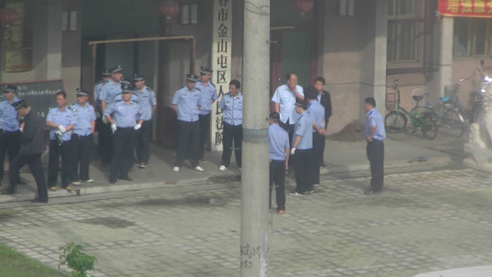 早8点30分相关人员进场。不许律师携带录音、录像设备,不许携带手机,律师说:“从没受到过这样不公正的对待”。三位大法弟子的家属只允许每家二人入场旁听,百姓一律不准入场、不准靠近二百米警戒线。同时金山屯通往外地的所有路口均被严格把守盘查出入人员。金山屯委书记李弘到场,省市也来了重要官员、伊春市市长也到场旁听。